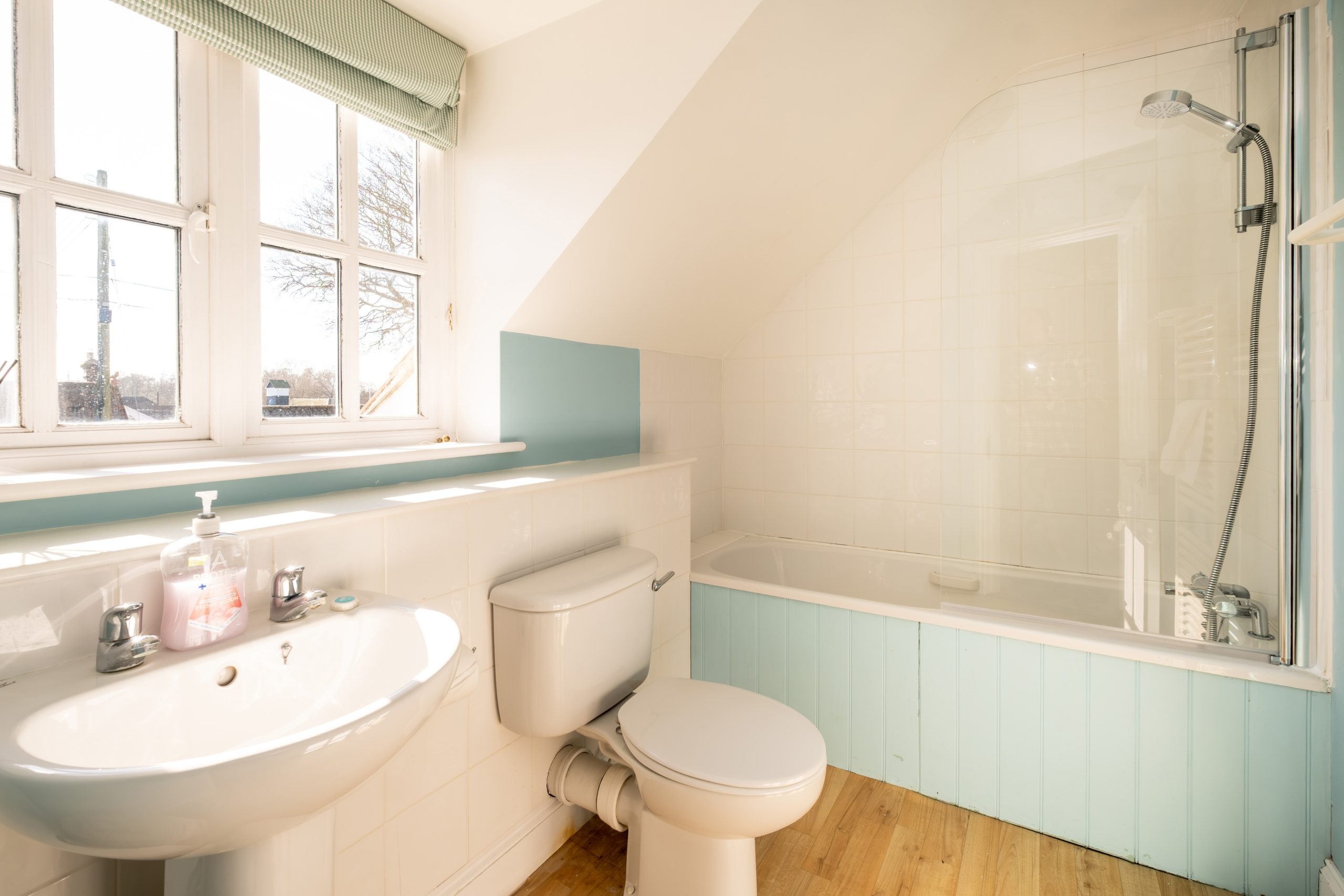 Family Bathroom: Shower over bath, heated towel rail, washbasin