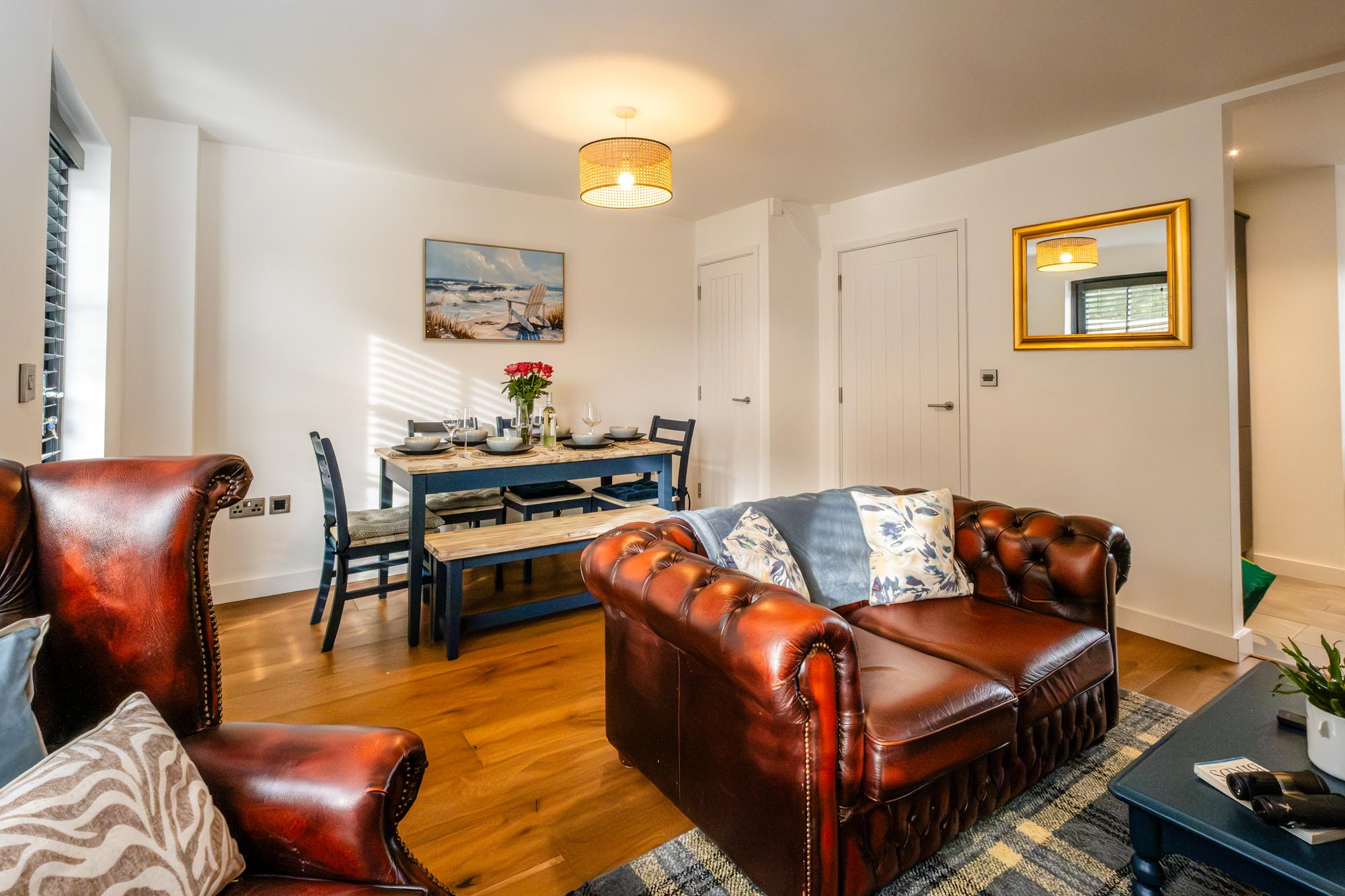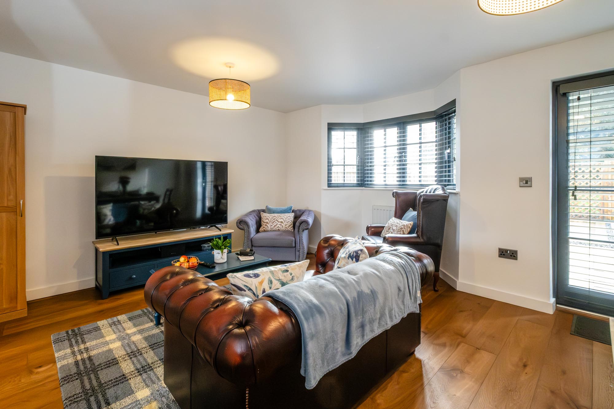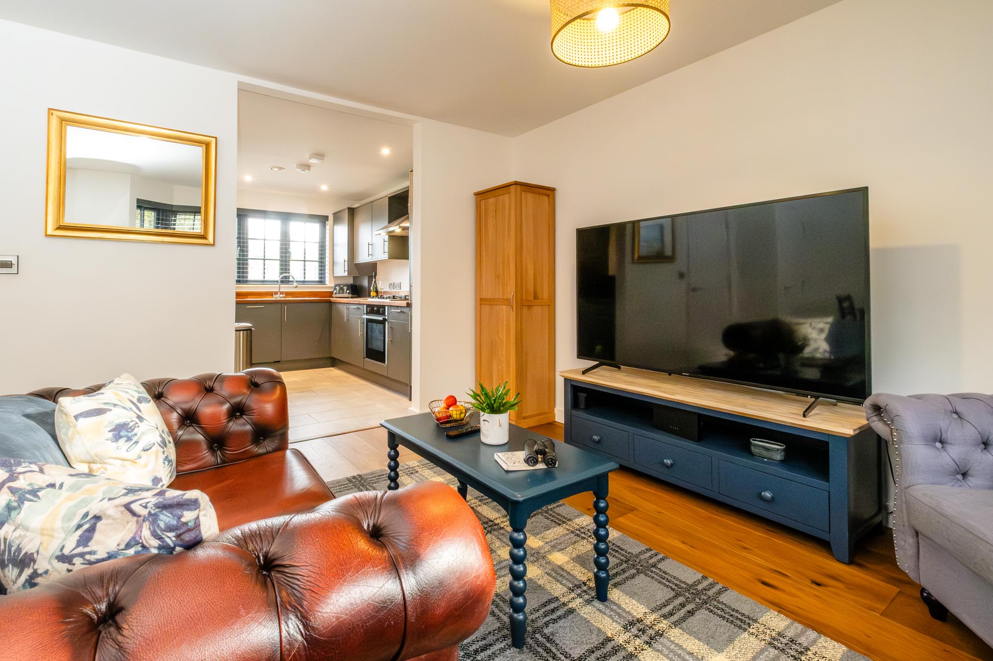 Comfortable seating, smart TV, WiFi. Dining table with seating for six guests and patio doors opening onto a rear garden