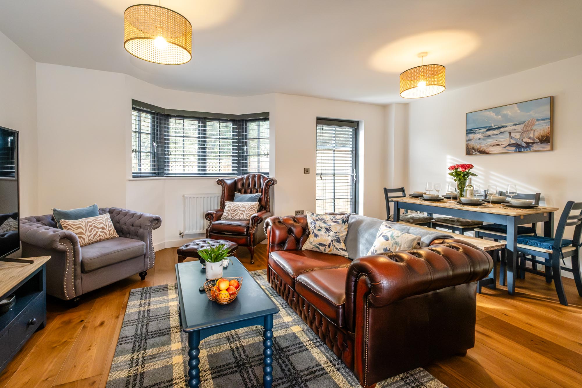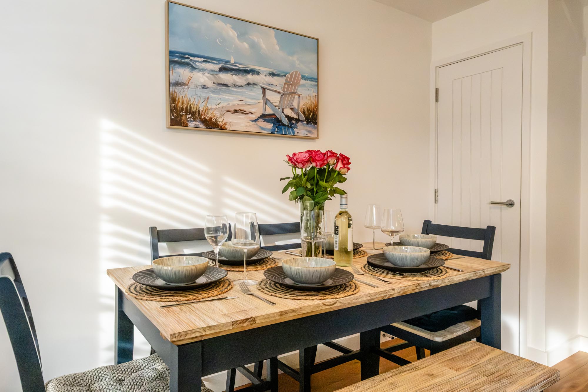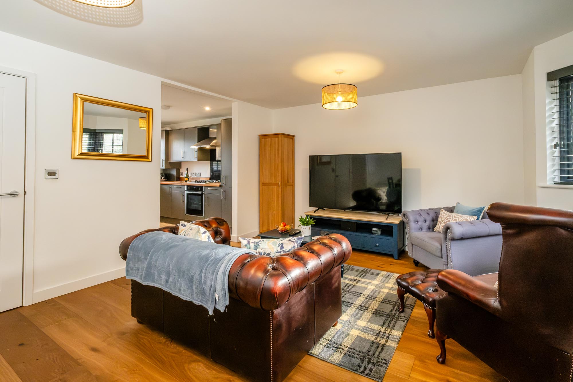 Comfortable seating, smart TV, WiFi. Dining table with seating for six guests and patio doors opening onto a rear garden